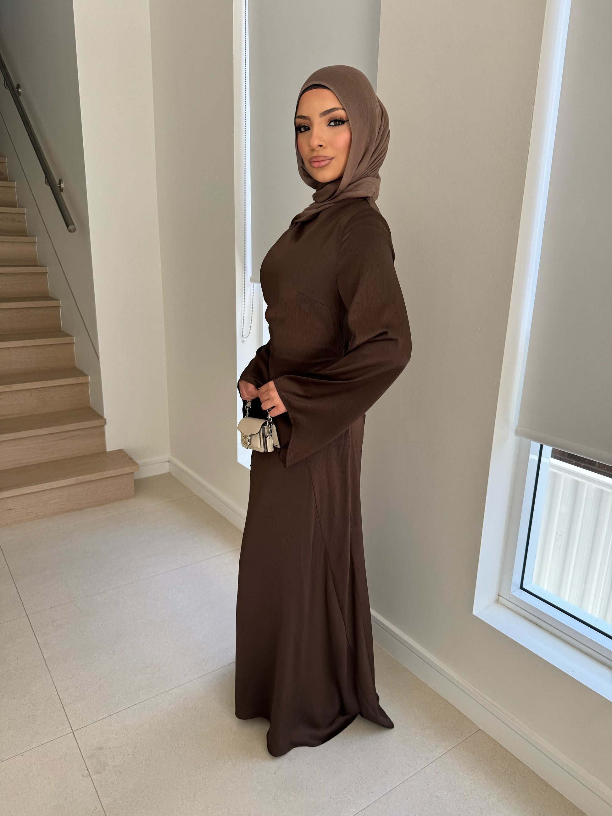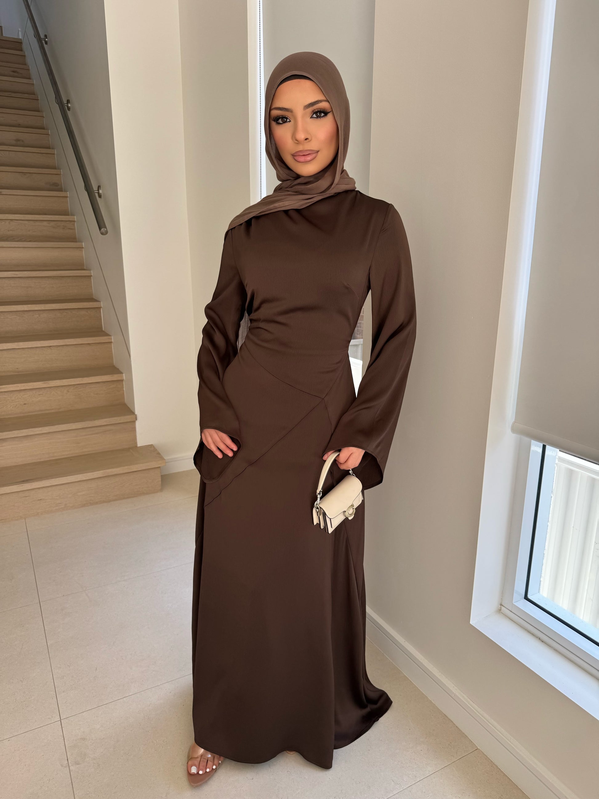 Model in brown wears size 6, 152cm tall